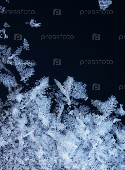 Вертикальная рамка зимнего фона с блестящими белыми кристаллами снежинок и инеем на голубом
