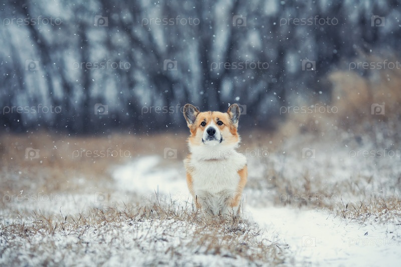 Красивый портрет смешной рыжий пес корги сидит в зимнем парке под падающим снегом