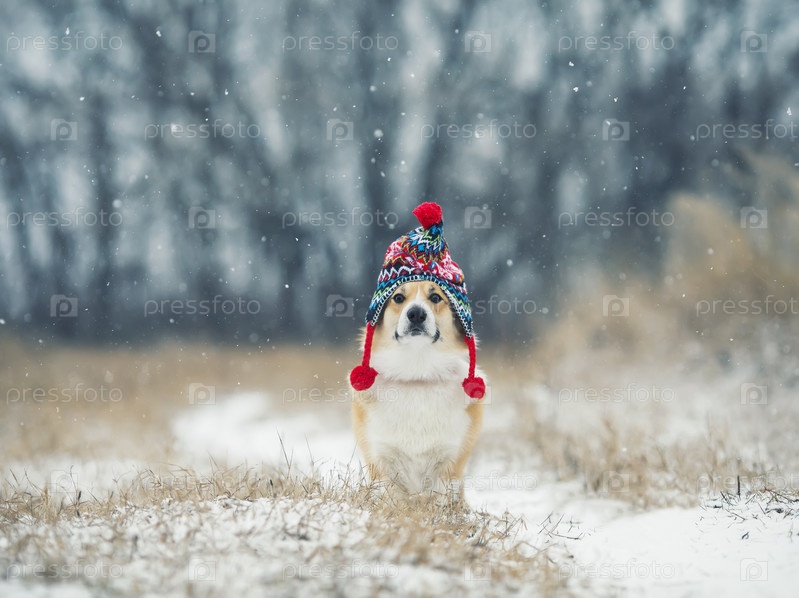 Красивый портрет смешной щенок корги сидит в зимнем парке в вязаной теплой красной шапке под падающим снегом