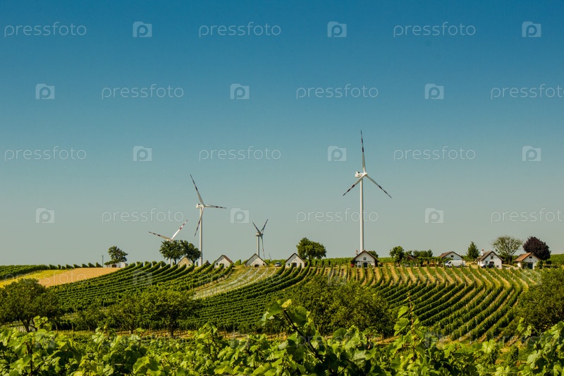Альтернативная энергия в деревне. Ветряные турбины в яркий солнечный день. Виноградники. Европа. Австрия. Виноградные плантации