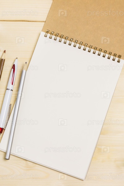 Легкий деревянный стол с блокнотом, ручкой и карандашами. Место под текстом. Вид сверху