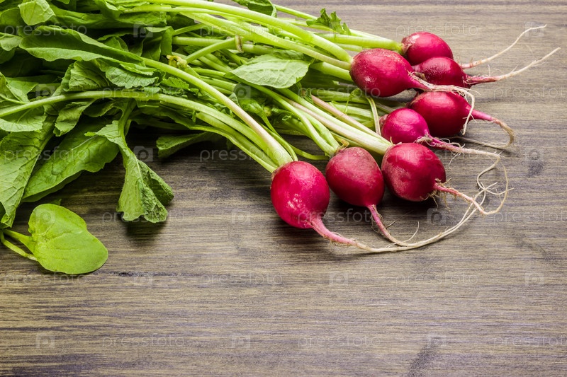 Здоровое питание и яркая еда. Свежий редис на деревенском столе. Красный редис. Свежие овощи