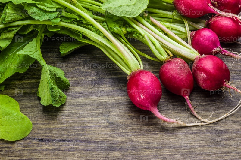 Здоровое питание и яркая еда. Свежий редис на деревенском столе. Красный редис. Свежие овощи