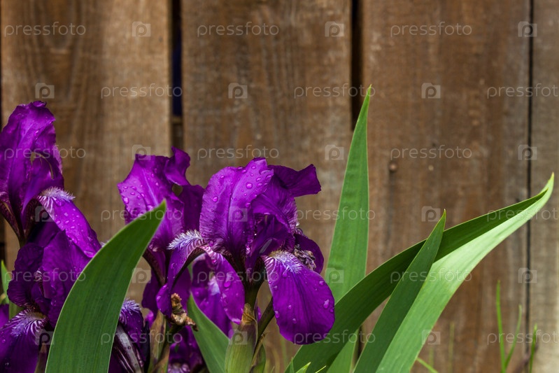 Фиолетовые ирисы в саду на деревянном фоне с местом для текста