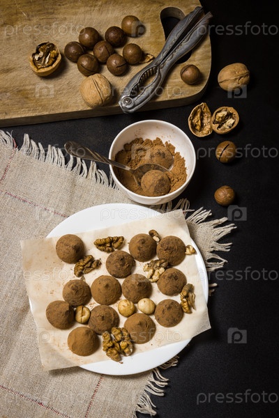 Шоколадные трюфели с орехами на темном фоне. Домашние сладости