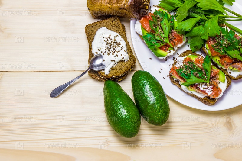 Бутерброды с авокадо, форелью и сметаной, посыпанные острым укропом. Листья сельдерея. Выборочный фокус