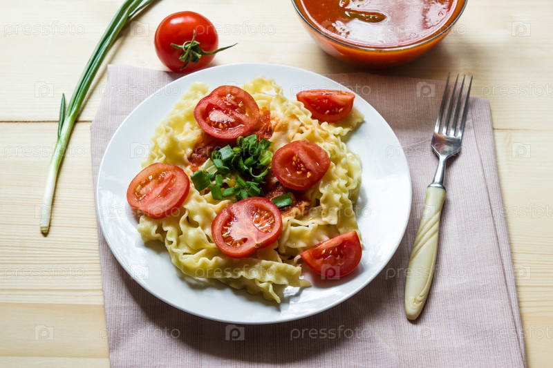 Паста со свежими помидорами и луком на белой тарелке. Луковые перья и свежий помидор. Салфетка бежевая. Домашняя паста из томатного соуса с томатным соусом. Светлый фон