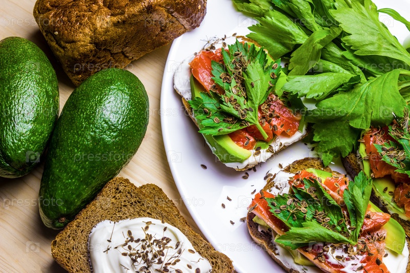 Бутерброды с авокадо, форелью и сметаной, посыпанные острым укропом. Листья сельдерея. Выборочный фокус