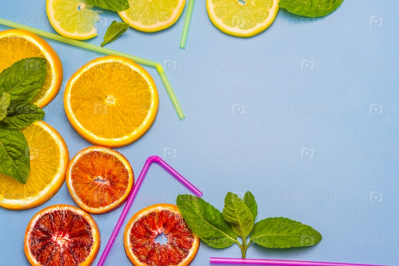 Красочные круглые ломтики апельсина, лимона, красного апельсина и листьев мяты. Соломинки для коктейлей. На синем фоне