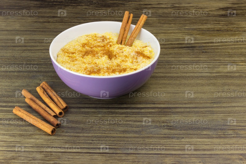 Кукурузная каша с арахисом и корицей в фиолетовой миске на деревянном столе