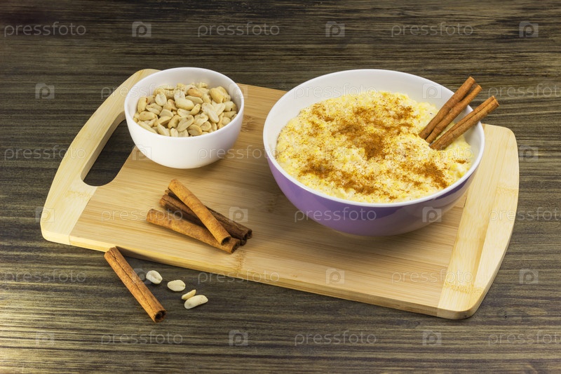 Кукурузная каша с корицей и арахисом на деревянной подставке, в фиолетовой миске на деревянном фоне и с палочками корицы