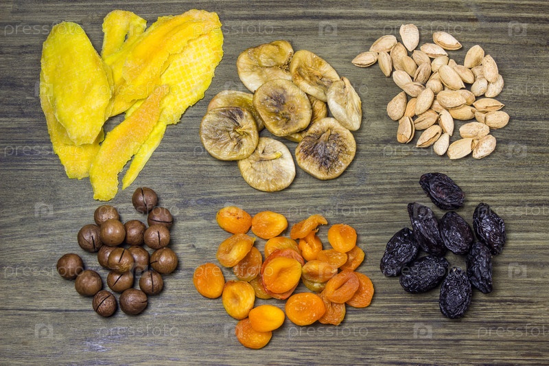 Смешанные сухофрукты. Символы еврейского праздника Ту би-Шват. Инжир, курага, чернослив, орехи, миндаль, манго сушеные, орехи микадамии. Деревянный стол. Место под текстом