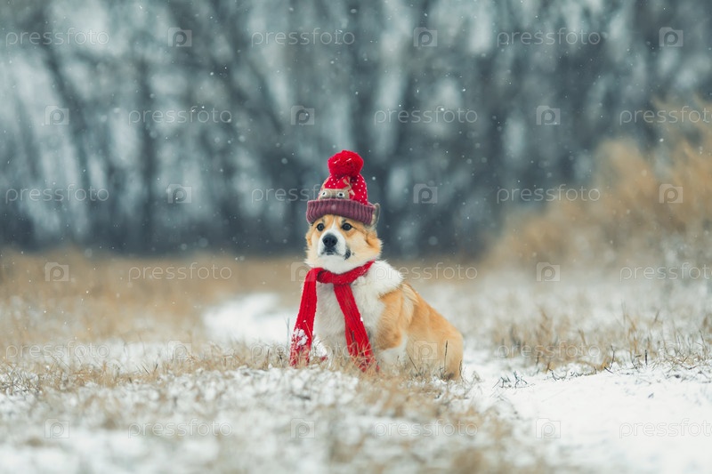 Щенки корги сидят в зимнем парке в вязаной теплой красной шапке и шарфе под падающим снегом