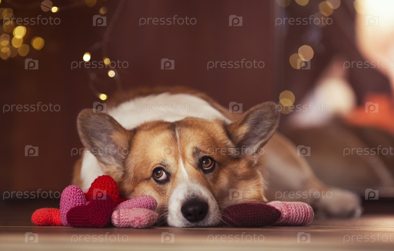 Портрет милого щенка корги, лежащего на полу в окружении любовных символов вязаных сердец