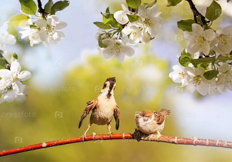 Птицы и воробьи сидят весенним солнечным цветением на ветвях яблони с белыми цветами