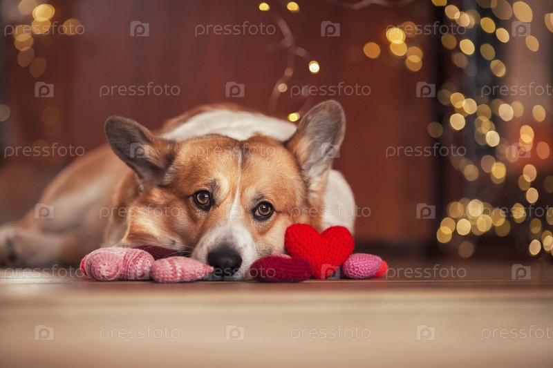 Портрет милого щенка корги, лежащего на полу в окружении любовных символов вязаных сердец