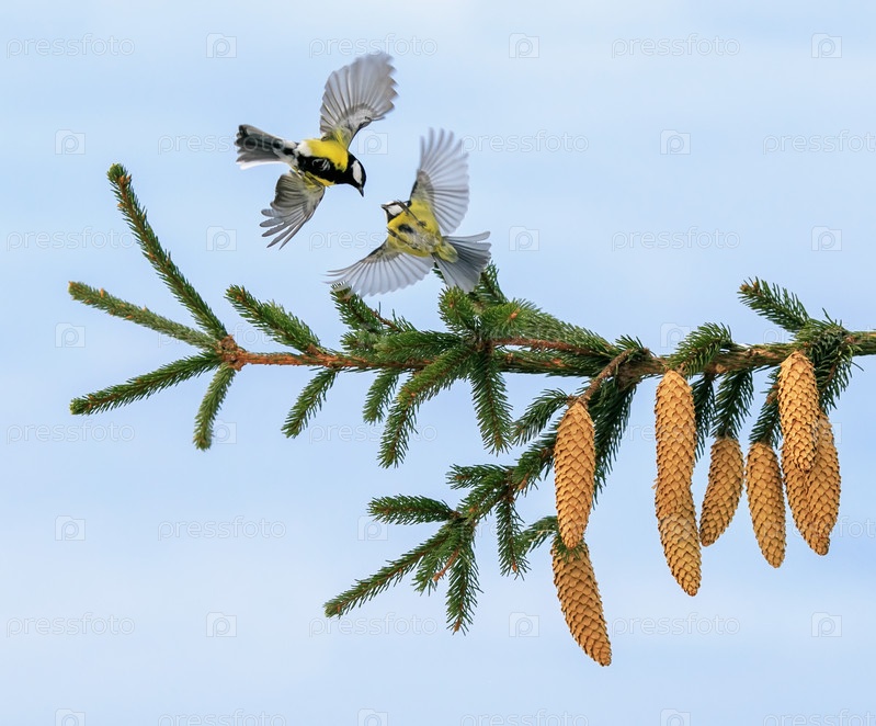 Синицы летают в зимнем рождественском парке над веткой ели с элегантными шишками