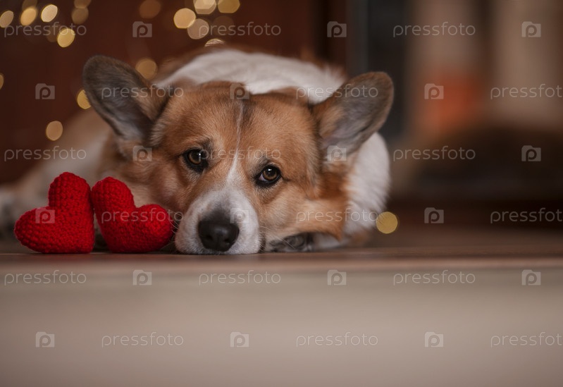 Милый портрет собаки корги лежит на полу рядом с двумя любовными символами вязаных красных сердец
