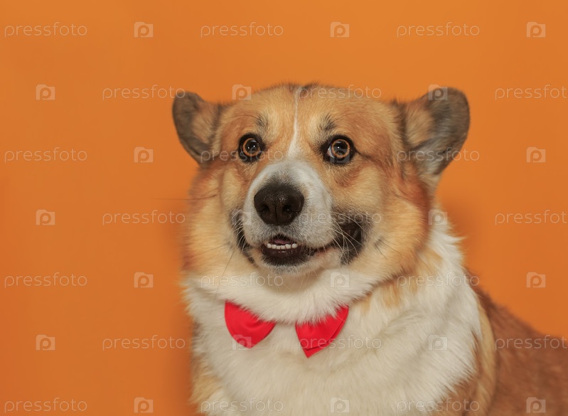 Портрет милого щенка корги с большими ушами на желтом изолированном фоне улыбается