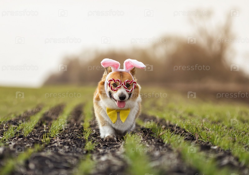 Милый щенок корги в ушах пасхального кролика бежит по зеленому весеннему полю