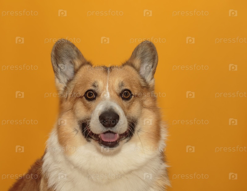 Портрет смешного щенка корги с большими ушами на желтом изолированном фоне с красивой улыбкой