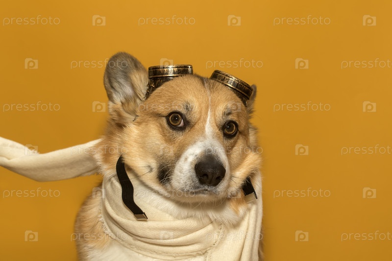 Портрет смешного щенка корги с большими ушами на желтом изолированном фоне в образе пилота в очках и шарфе