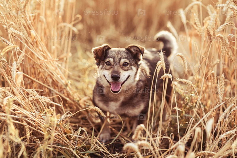 Милая собака гуляет по полю спелых колосьев пшеницы в солнечный летний день и улыбается
