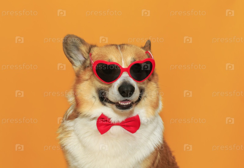 Портрет смешного щенка корги с большими ушами на желтом изолированном фоне в очках с красными сердцами