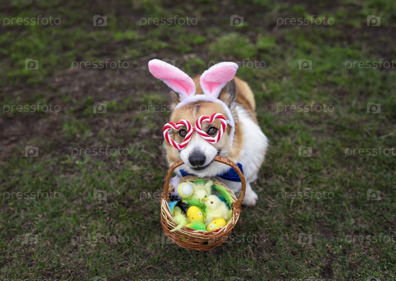 Милый щенок корги в ушах и очках пасхального кролика сидит на траве с корзиной яиц и цыплят