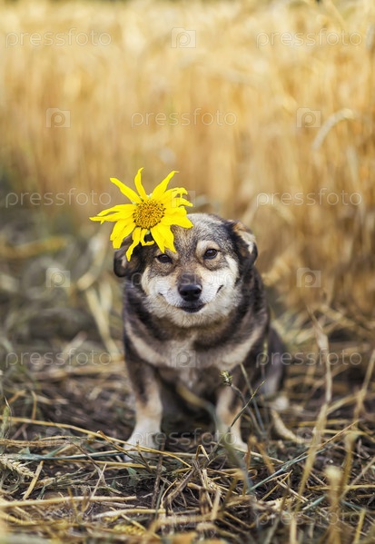 Вертикальный портрет милой собаки, сидящей на поле спелых колосьев пшеницы в солнечный летний день и улыбающейся