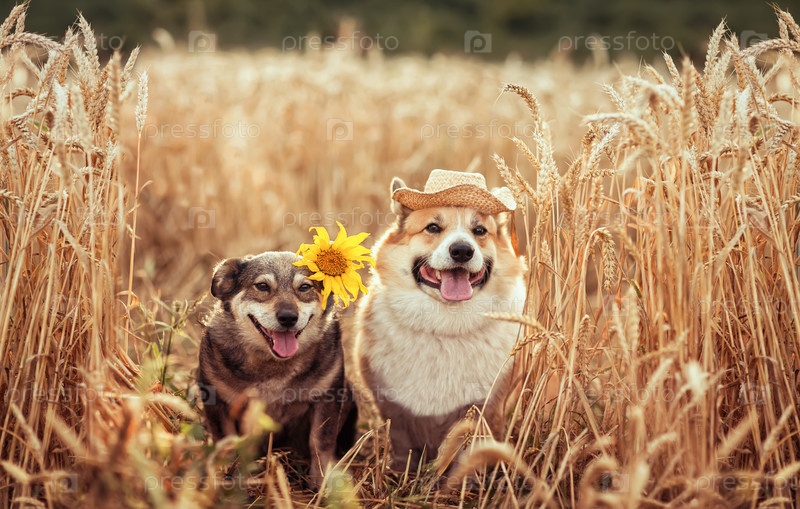 Пара милых собак в шляпе подсолнуха, сидящих на поле спелых колосьев пшеницы в солнечный летний день