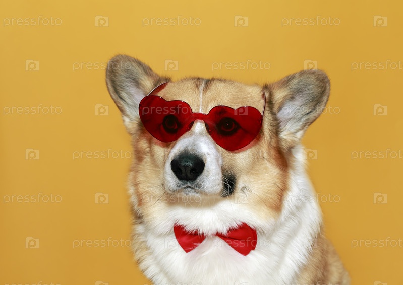 Забавный щенок корги с большими ушами на желтом изолированном фоне в очках из красных сердец
