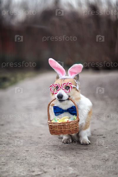 Милый щенок корги в ушах и очках пасхального кролика сидит в саду с корзиной праздничных яиц и цыплят