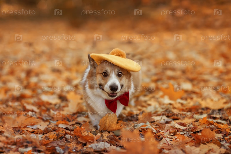 Милая собака корги в берете и галстуке сидит в осеннем парке среди опавших золотых листьев