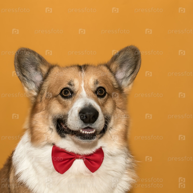 Щенки корги с большими ушами на желтом изолированном фоне портрет