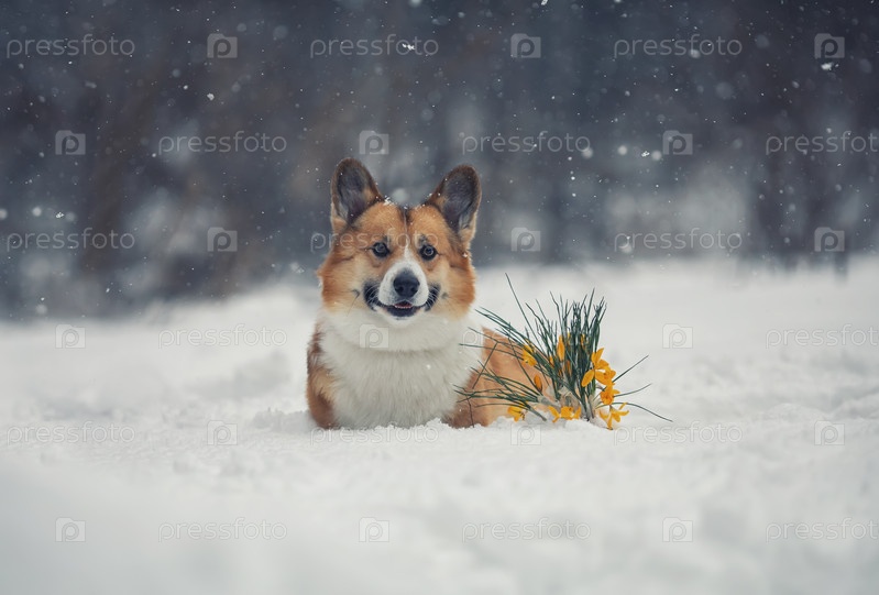Портрет милой собаки корги, сидящей на снегу в парке рядом с цветущим желтым подснежником ранней весной и улыбающейся
