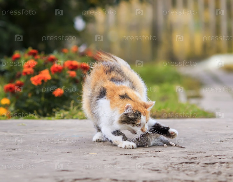 Кошка играет в саду с пойманной грызуном крысой, высоко подпрыгивая и ловя ее лапами