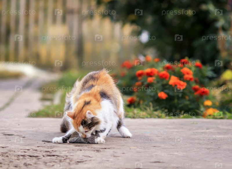 Пушистый кот играет в саду с серой крысой, пойманной грызуном, ловящим ее лапами и зубами