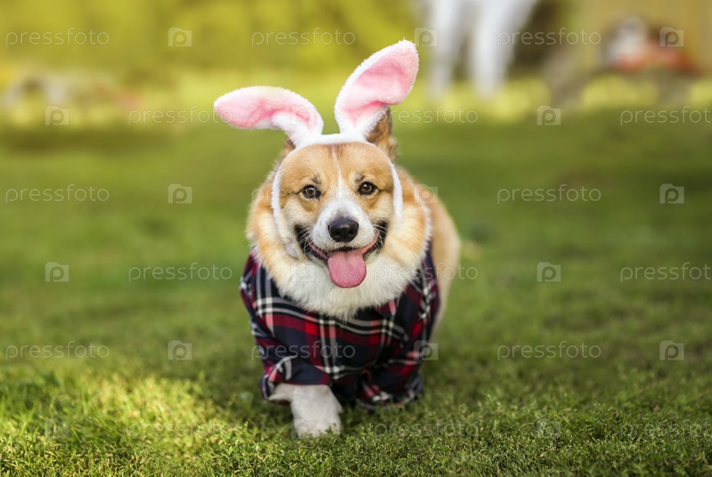 Очаровательный щенок корги пемброк бежит по зеленой траве в розовых кроличьих ушах и клетчатой рубашке