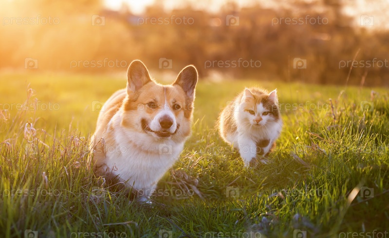 Пушистые друзья собака и кошка дружно гуляют по яркому летнему лугу на солнце