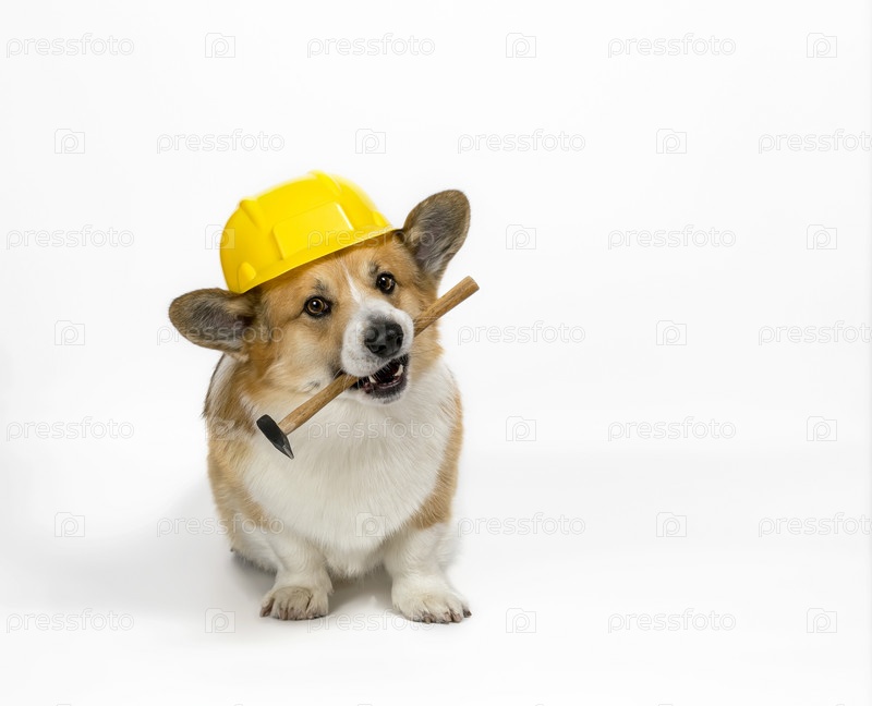 Милая собака корги в желтом строительном шлеме с молотком в зубах на белом фоне