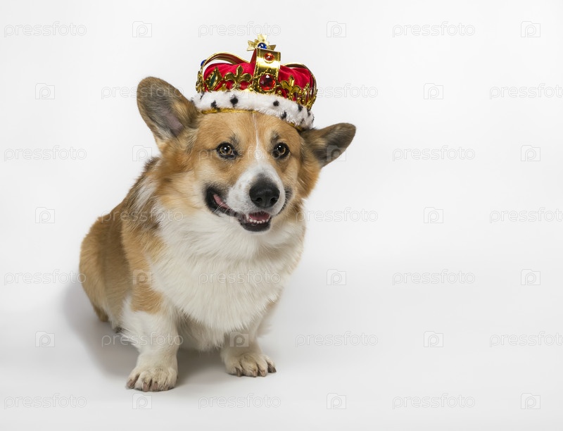 Изолированный портрет милого щенка корги в красной королевской золотой тиаре, украшенной драгоценными камнями на белом фоне, сидящего и улыбающегося