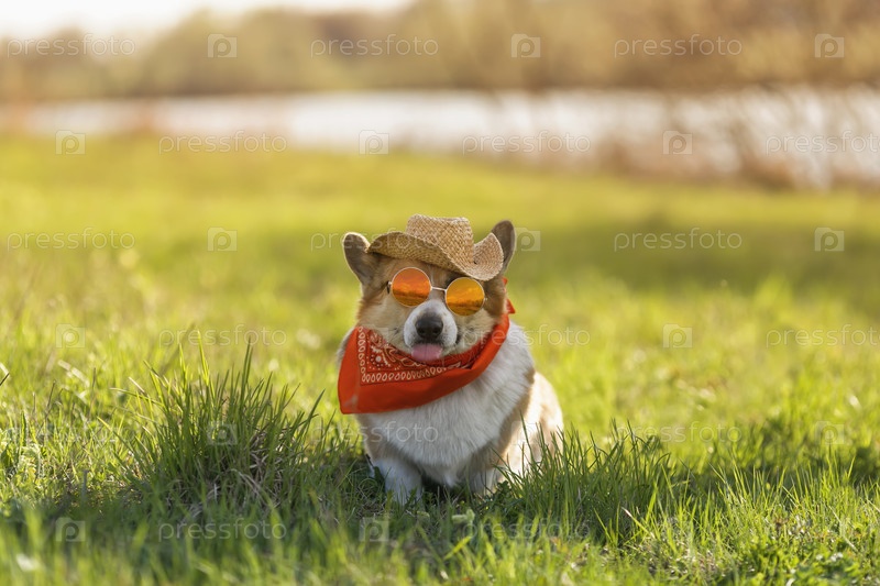 Милый щенок корги в солнцезащитных очках и соломенной шляпе сидит на летнем лугу в зеленой траве