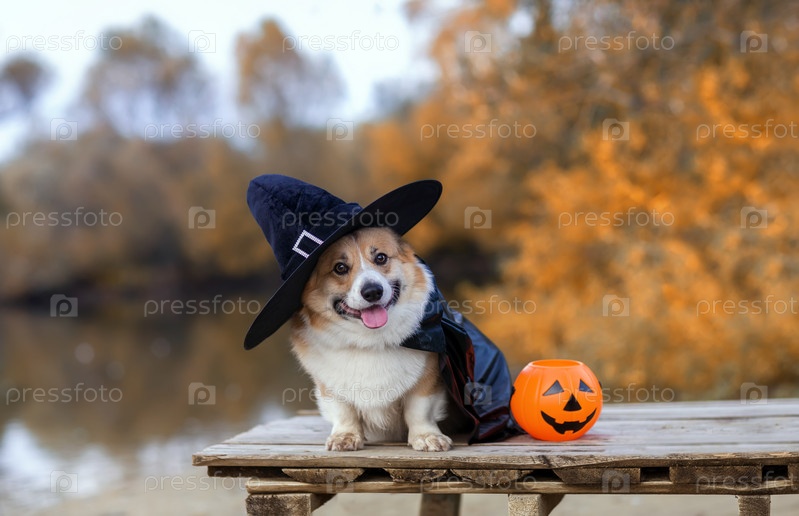 Открытка на Хэллоуин собака корги в карнавальной черной шляпе сидит на мосту в осеннем парке рядом с тыквой