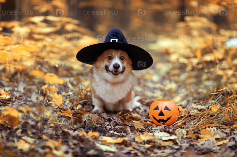Милая собака корги в причудливой черной шляпе сидит в осеннем парке с тыквой на хэллоуин