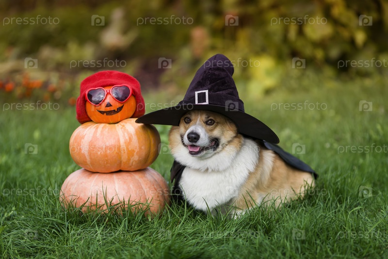 Милая открытка на хэллоуин с тыквой в карнавальной шляпе, милый щенок корги в плаще супермена сидит в осеннем саду на зеленой траве