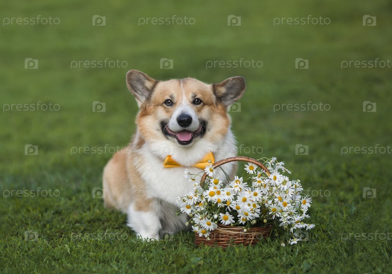 Милый щенок корги сидит на летнем лугу с корзиной цветов белых ромашек