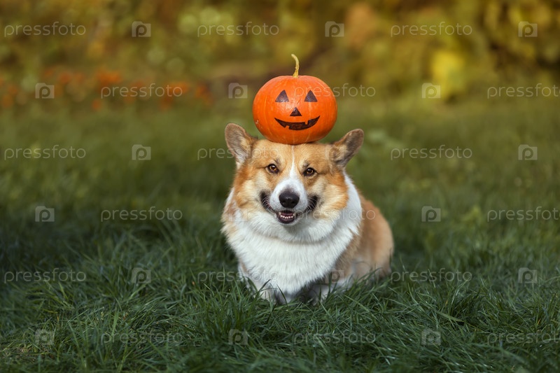 Милая открытка на хэллоуин милый щенок корги с тыквой на голове сидит в осеннем саду на зеленой траве и улыбается