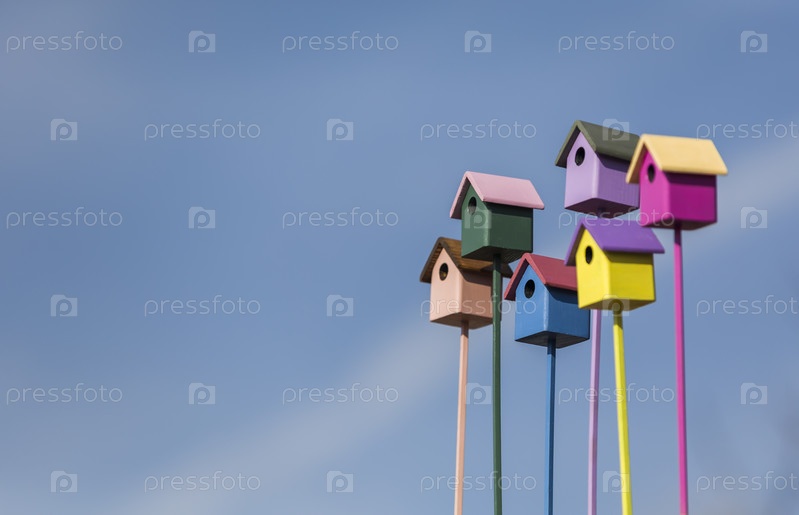 Группа красочных деревянных скворечников на фоне голубого неба в весеннем саду для привлечения птиц
