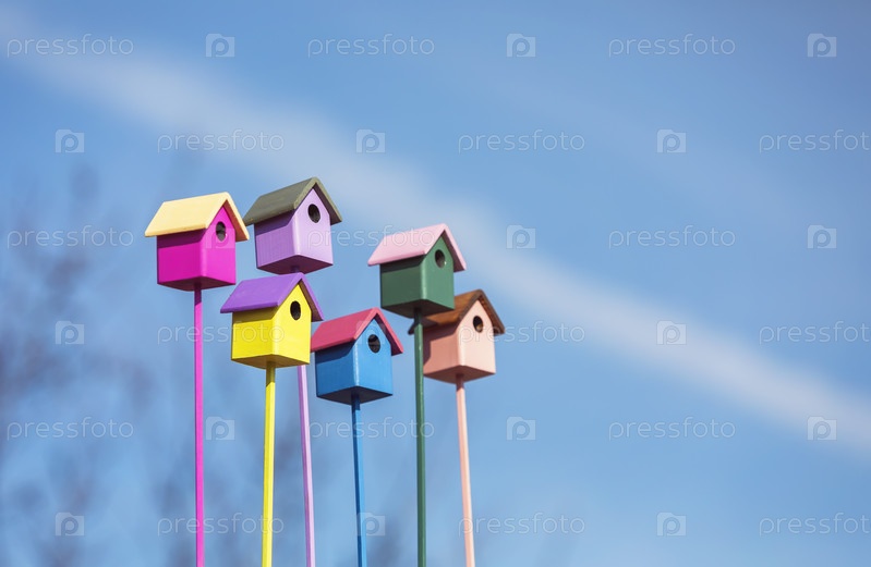 Добро пожаловать в группу красочных деревянных скворечников на фоне голубого неба в весеннем саду, чтобы привлечь птиц